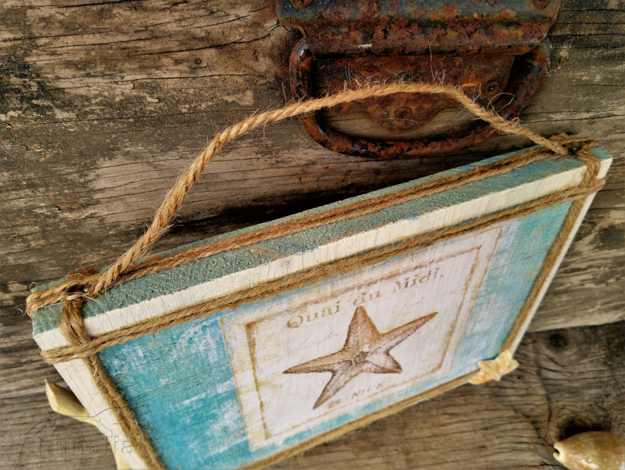 Ho stampato l'illustrazione con una stampante laser, ho preparato una tavoletta di legno di abete e sono passata alla decorazione con la tecnica del découpage. Alcuni giri di spago in lino sono serviti per rifinire e appendere la tavoletta senza bisogno di ganci o attaccaglie, mentre una piccola stella marina di resina, colorata con qualche pennellata di acrilico e saldamente incollata in un angolo, era quello che ci voleva per completare il lavoro.